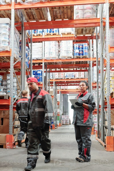 Молодая смешанная женщина-работница большого склада, использующая сенсорный панель в проходе