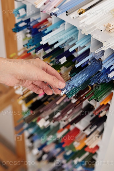 Рука молодой современной женщины-ремесленницы, принимающей длинную голубую стеклянную заготовку