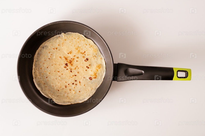 Вид сверху черной сковородки с горячим домашним аппетитным блинчиком на столе