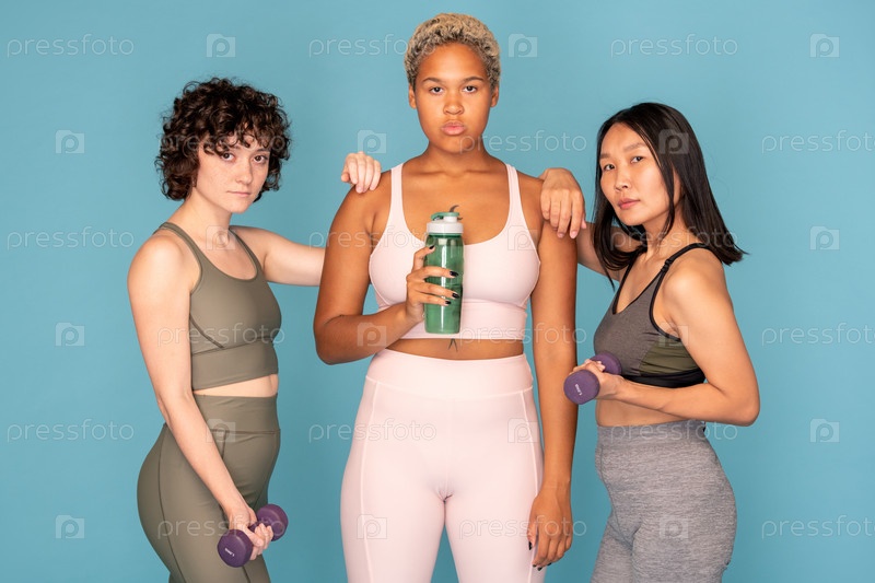 Две фитнес-девушки с гантеликами кладут руки на плечи своему африканскому другу