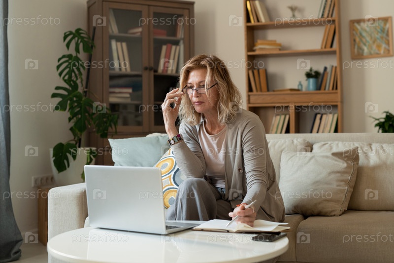 Серьезная зрелая блондинка бизнес-леди в повседневной одежде, сидящая на диване у маленького стола