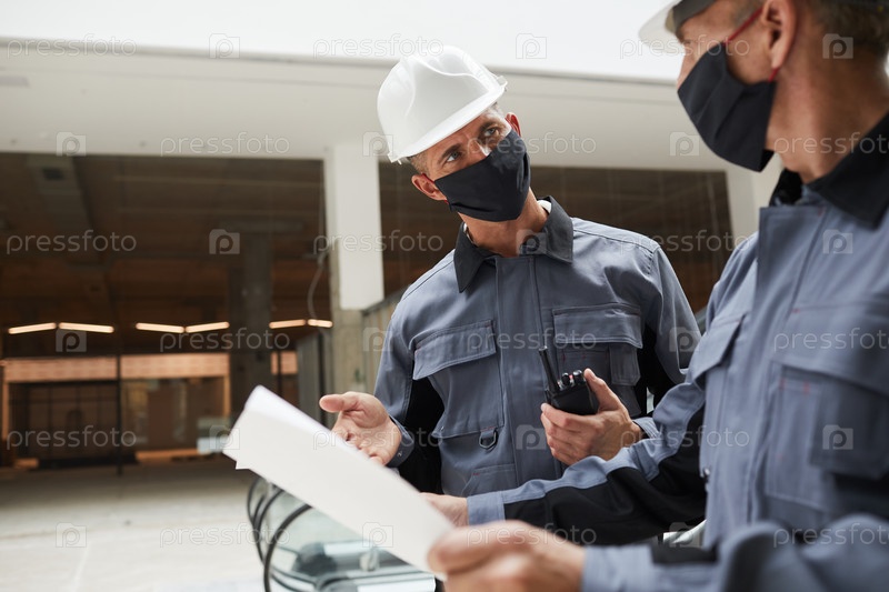 Работники, носящие маски на строительной площадке