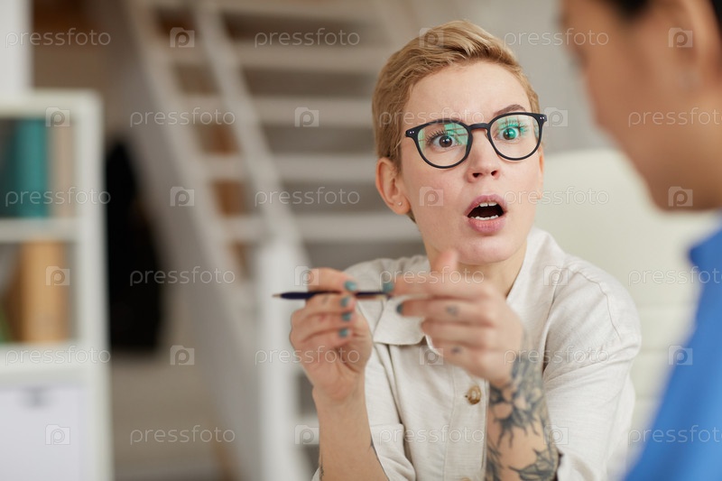 Шокированная бизнесвумен разговаривает с коллегой