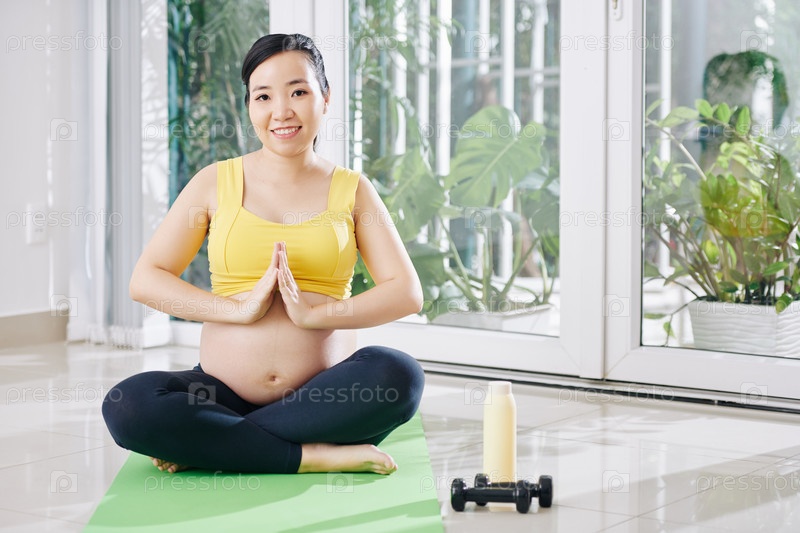 Беременная молодая женщина занимается йогой