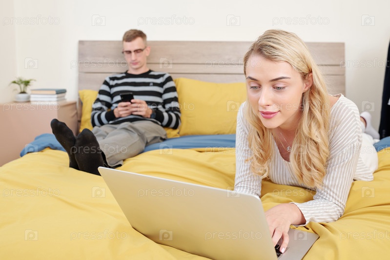 Молодая женщина работает на ноутбуке в постели