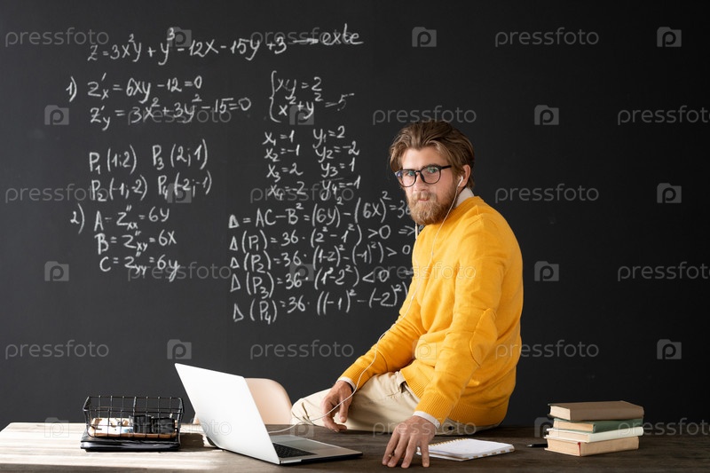 Молодая серьезная учительница с наушниками смотрит на тебя, сидя за столом
