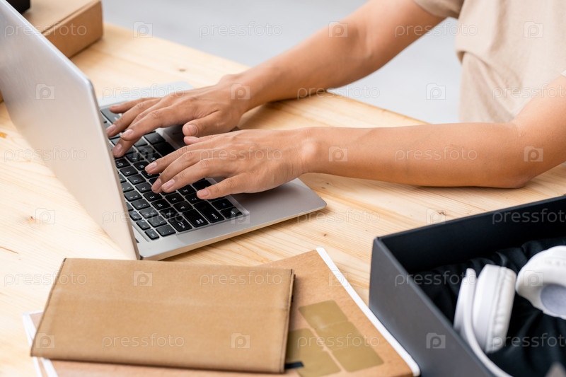 Руки молодой женщины-менеджера интернет-магазина, касающейся ключей клавиатуры ноутбука