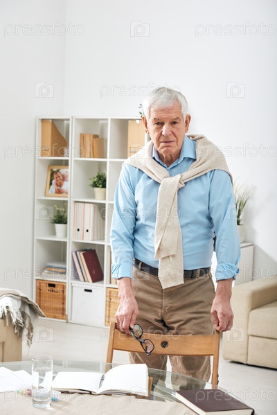 Пожилой пенсионер в повседневной одежде смотрит на вас, стоя у стула