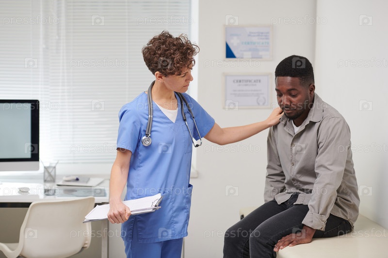 Горизонтальный средний длинный снимок профессиональной женщины-врача, утешающей грустного афроамериканского пациента