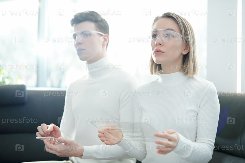 Два молодых IT-инженера в белых джемперах и очках, использующих прозрачные гаджеты