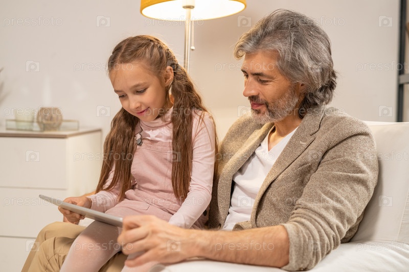 Счастливый дедушка держит свою внучку на коленях, сидя в кресле