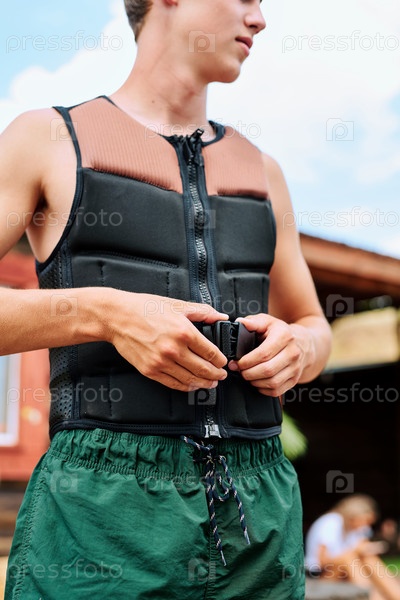 Руки молодого современного спортсмена, пристегивающего ремень на черном защитном жилете