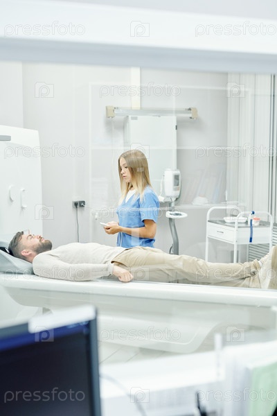 Молодая блондинка-врач в медицинской форме стоит рядом с бородатым пациентом