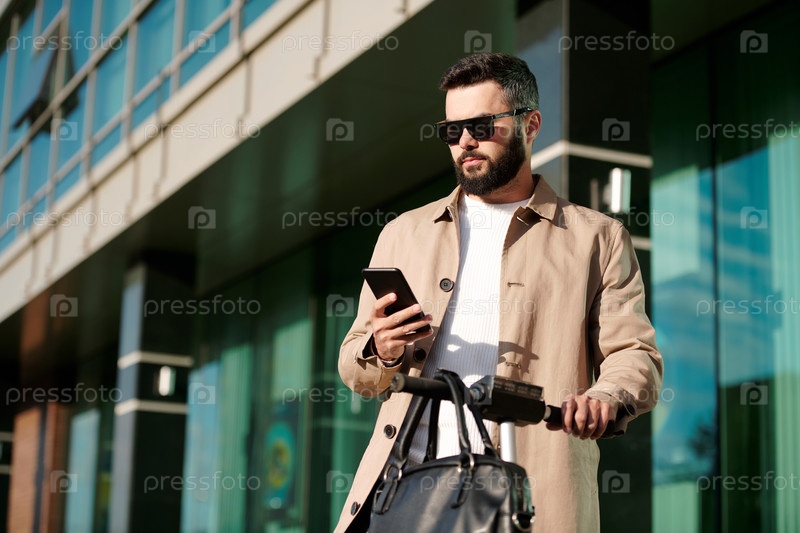 Серьезный молодой бизнесмен в бежевом плаще и солнцезащитных очках с помощью смартфона
