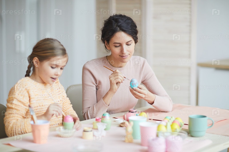 Молодая мать рисует пасхальные яйца дома