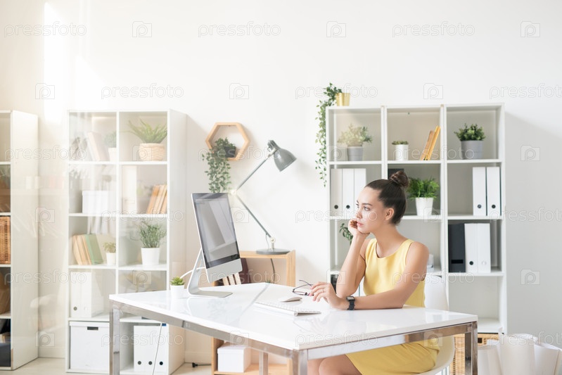 Молодая задумчивая бизнесвуменка в элегантном желтом платье смотрит на компьютерный экран