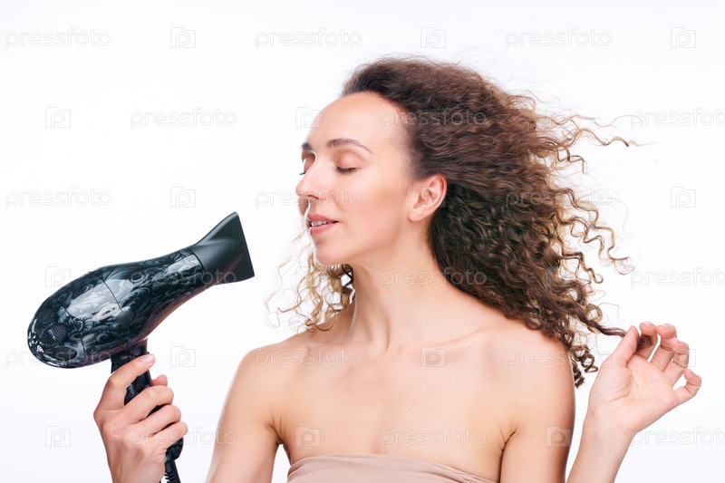 Молодая красивая женщина с закрытыми глазами высушивает свои прекрасные длинные коричневые волнистые волосы