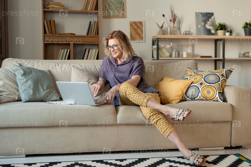 Счастливая блондинка-зрелая женщина сидит на удобном диване перед ноутбуком