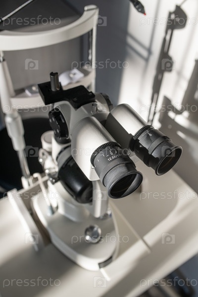 Окуляры с линзой офтальмологического диагностического оборудования на рабочем месте врача