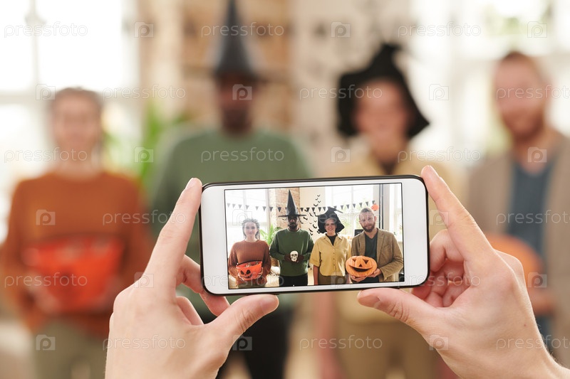 Руки используют смартфон, фотографируя людей с украшениями Хэллоуина на вечеринке, фото для социальных сетей