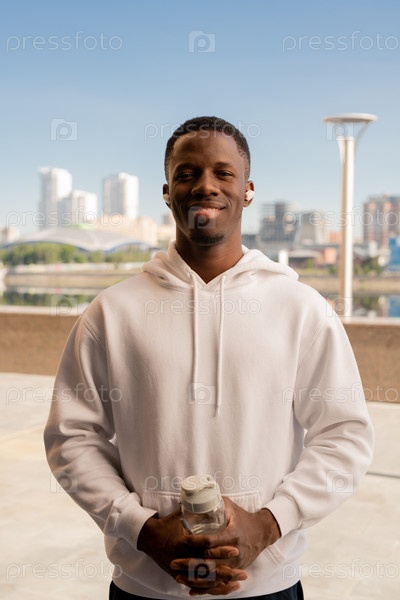 Счастливый молодой африканский спортсмен с зубчатой улыбкой, держащий бутылку воды