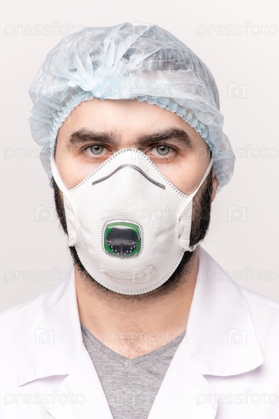 Серьезный хирург или врач в медицинской шапке, защитных очках и респираторе