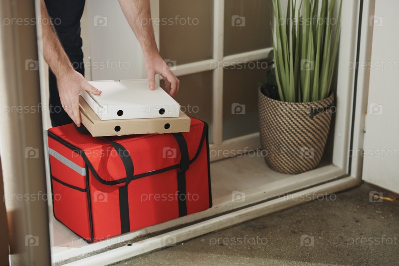 Руки больного человека, берущего пиццу и сумку с продуктами питания, доставленные курьером