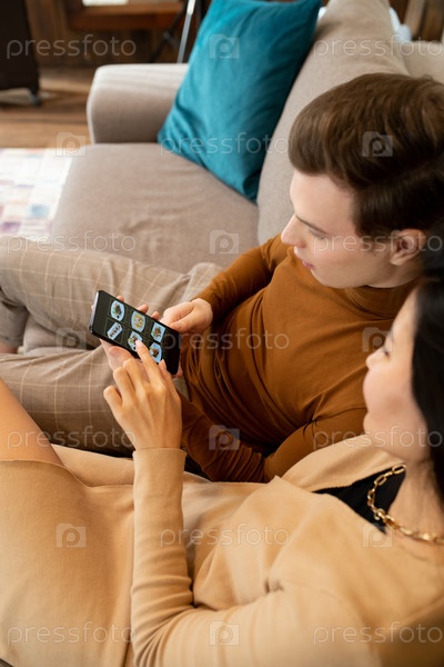 Молодая азиатская женщина сидит на диване рядом со своим мужем, заказывая суши на обед