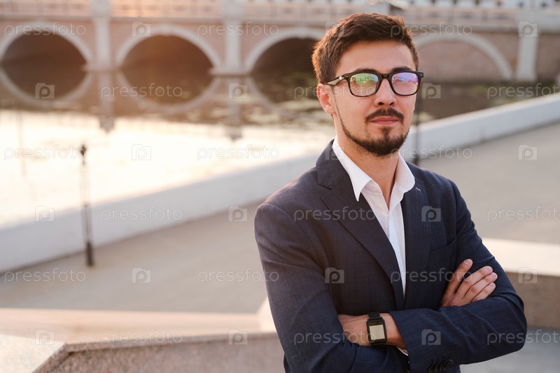 Молодой уверенный бизнесмен в костюме и очках, держа руки скрещенными