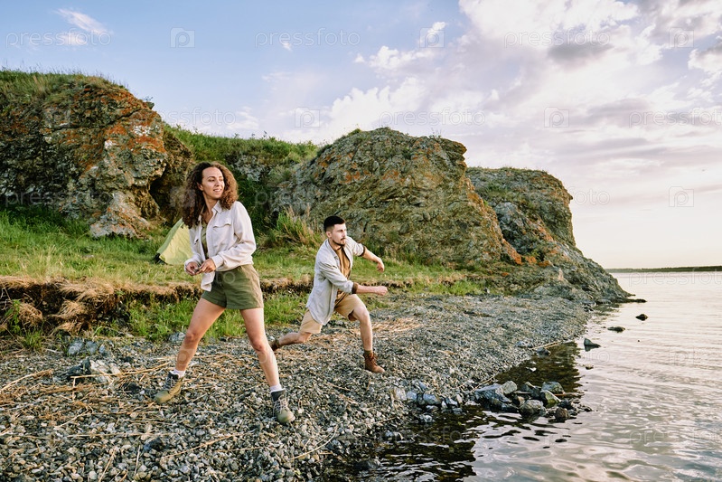 Счастливая молодая пара в сапогах, шортах и рубашках бросает камни в воду