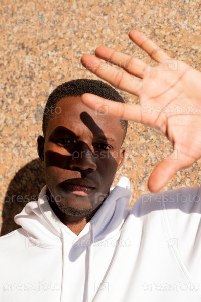 Молодой серьезный спортсмен африканской этнической принадлежности смотрит на умные часы на левом запястье