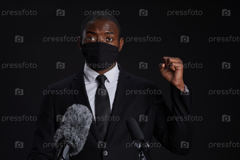 Африканский мужчина, разговаривающий с микрофоном в маске