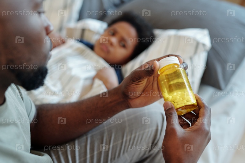 Руки молодого осторожного отца, держащего бутылку с таблетками против больного маленького сына