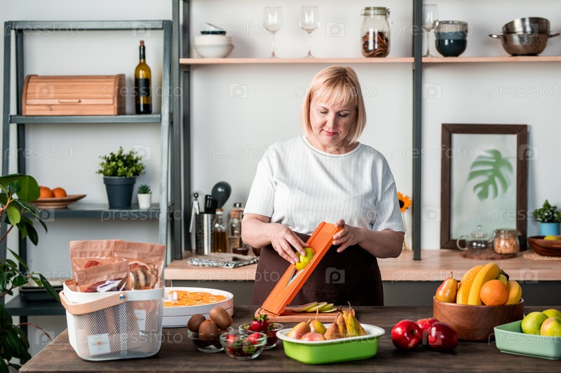 Блондинка стоит за кухонным столом с разнообразными свежими фруктами