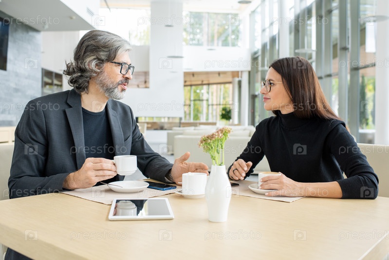 Коллеги-мужчины и женщины в умной повседневной одежде и очках пьют кофе