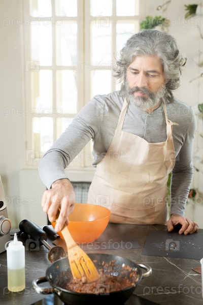 Серьезный зрелый мужчина с бородой смешивает измельченное мясо в сковороде у электрической плиты