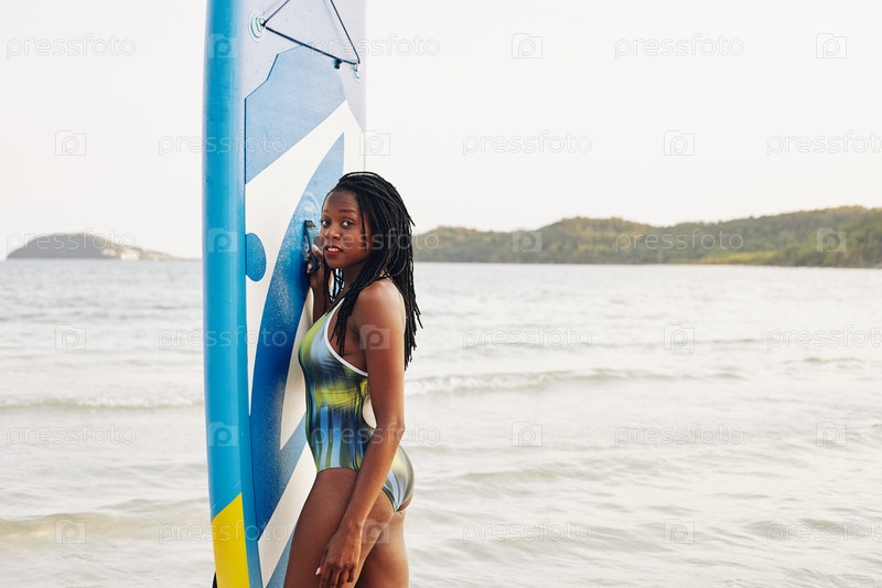 Женщина позирует с настольной доской для серфинга