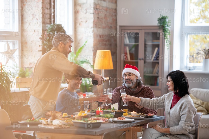 Бородатый мужчина средних лет наливает шампанское на флейты членов семьи