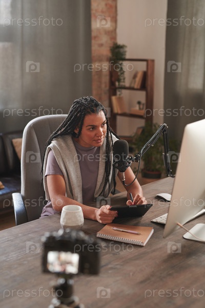Вертикальный высокоугольный снимок современной молодой женщины в повседневной одежде, сидящей за столом в комнате на чердаке с помощью графической панели во время создания контента для блога