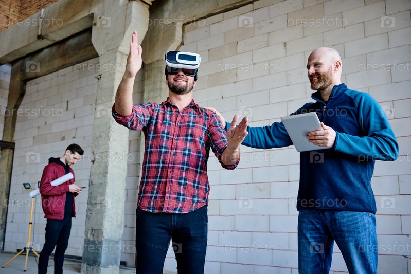 Молодой инженер в VR гарнитуре делает презентацию новых материалов для мебели
