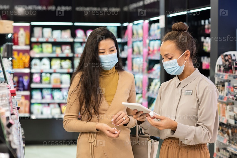 Молодой консультант по защитной маске ищет цену на блеск для губ в таблетках