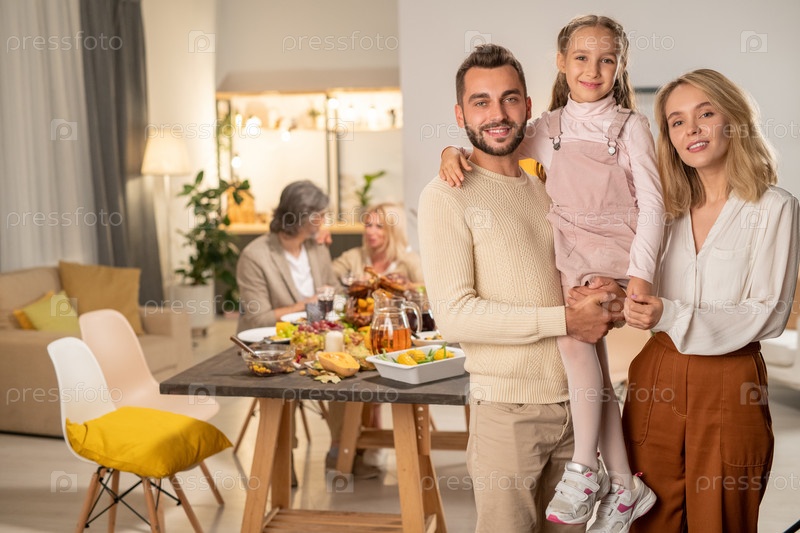 Счастливая молодая семья отца, матери и милая дочка смотрят на вас