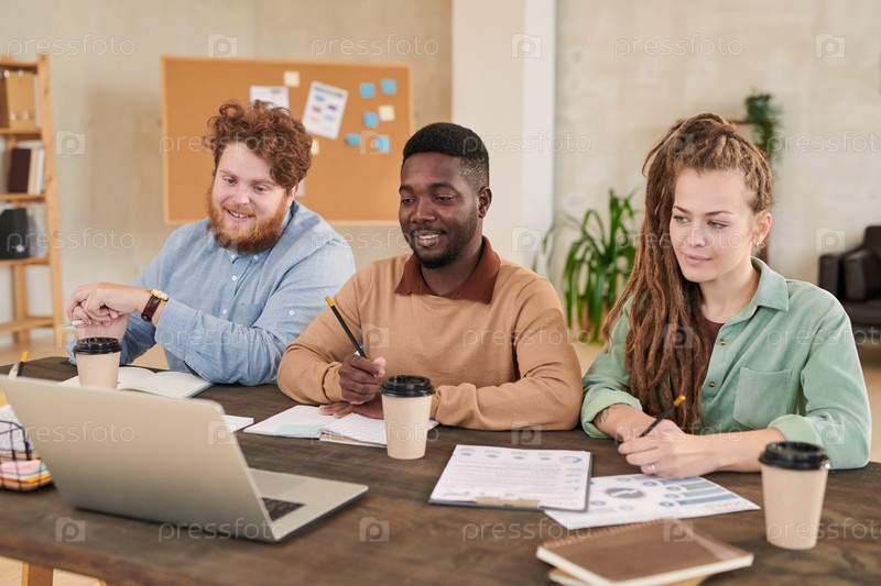 Содержание любопытных молодых мультиэтнических коллег, сидящих за столом в офисе и использующих ноутбук во время изучения курса маркетинга онлайн