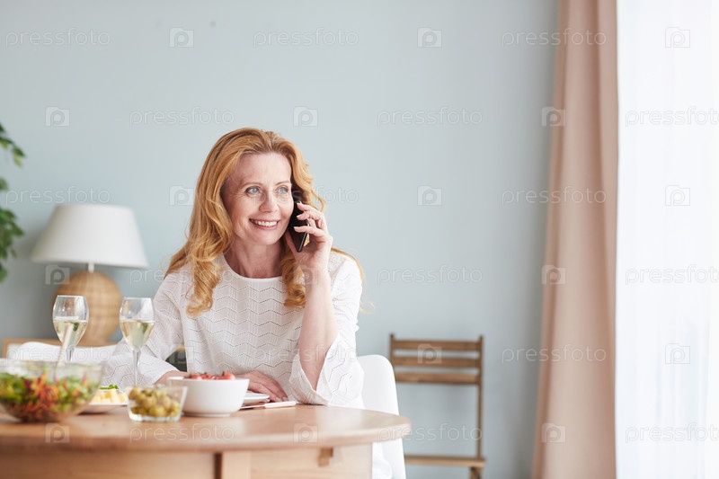 Элегантная зрелая женщина разговаривает по телефону и улыбается