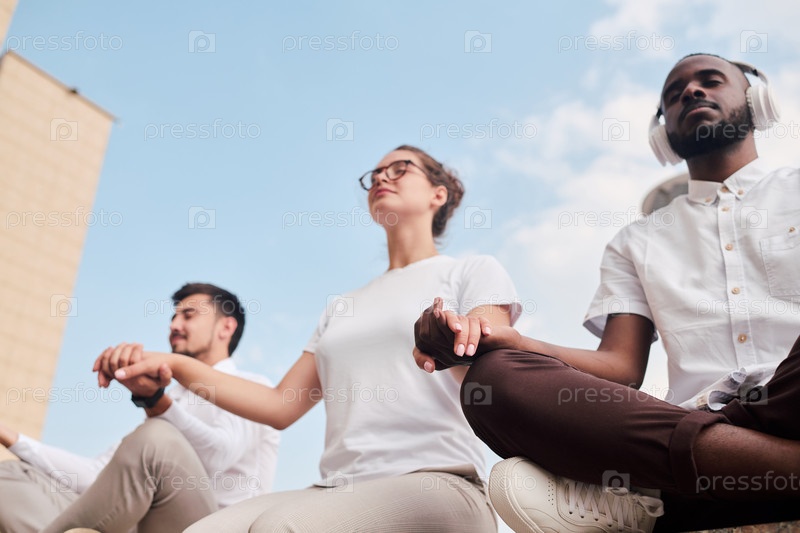 Группа молодых спокойных рабочих белых воротничков в повседневной одежде, держащихся за руки