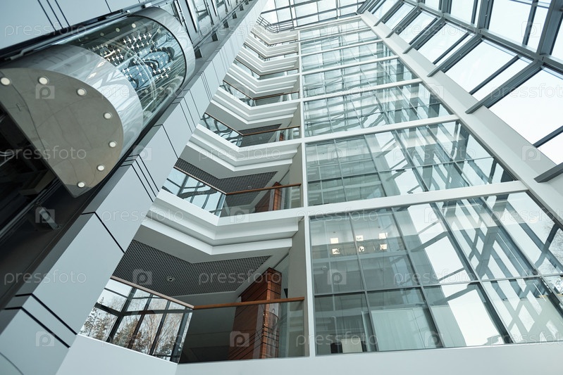 Часть интерьера современного офисного центра с лифтом и балконами