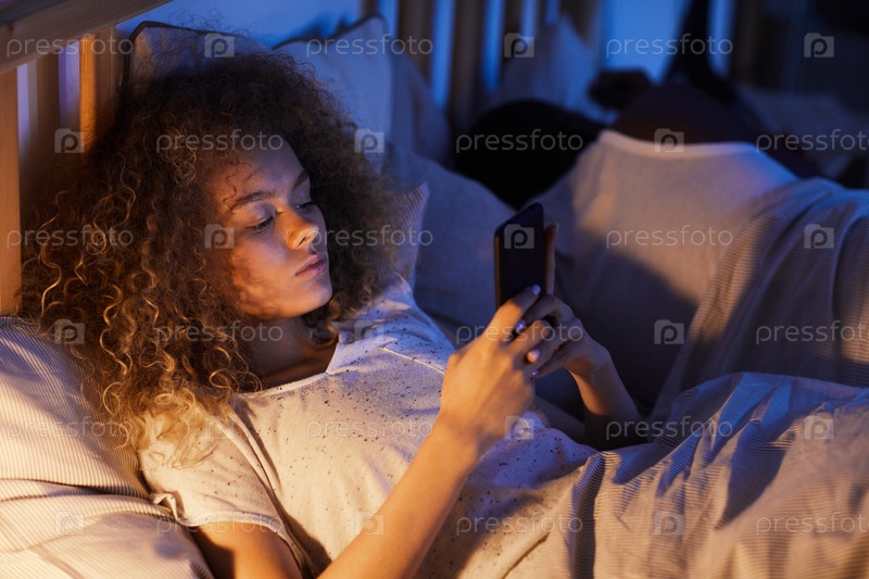Молодая женщина использует смартфон в постели со спящим мужем