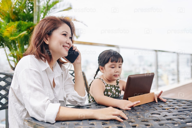 Улыбающаяся мать звонит по телефону