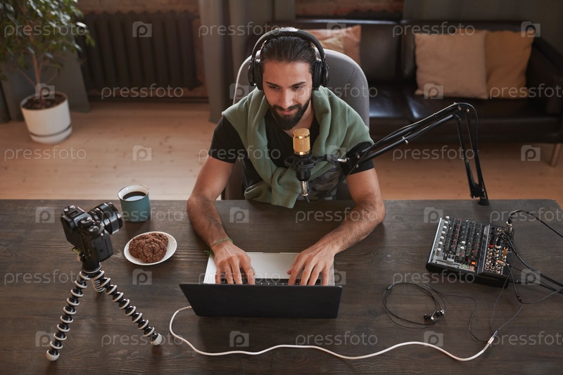Горизонтальный высокоугольный снимок современной бородатой молодой ближневосточной влиятельной личности в повседневной одежде, сидящей за столом одна на чердаке комнаты с помощью ноутбука