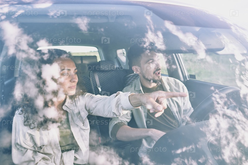 Молодая женщина с кудрявыми волосами, указывающими вперед, сидит в машине со своим мужем